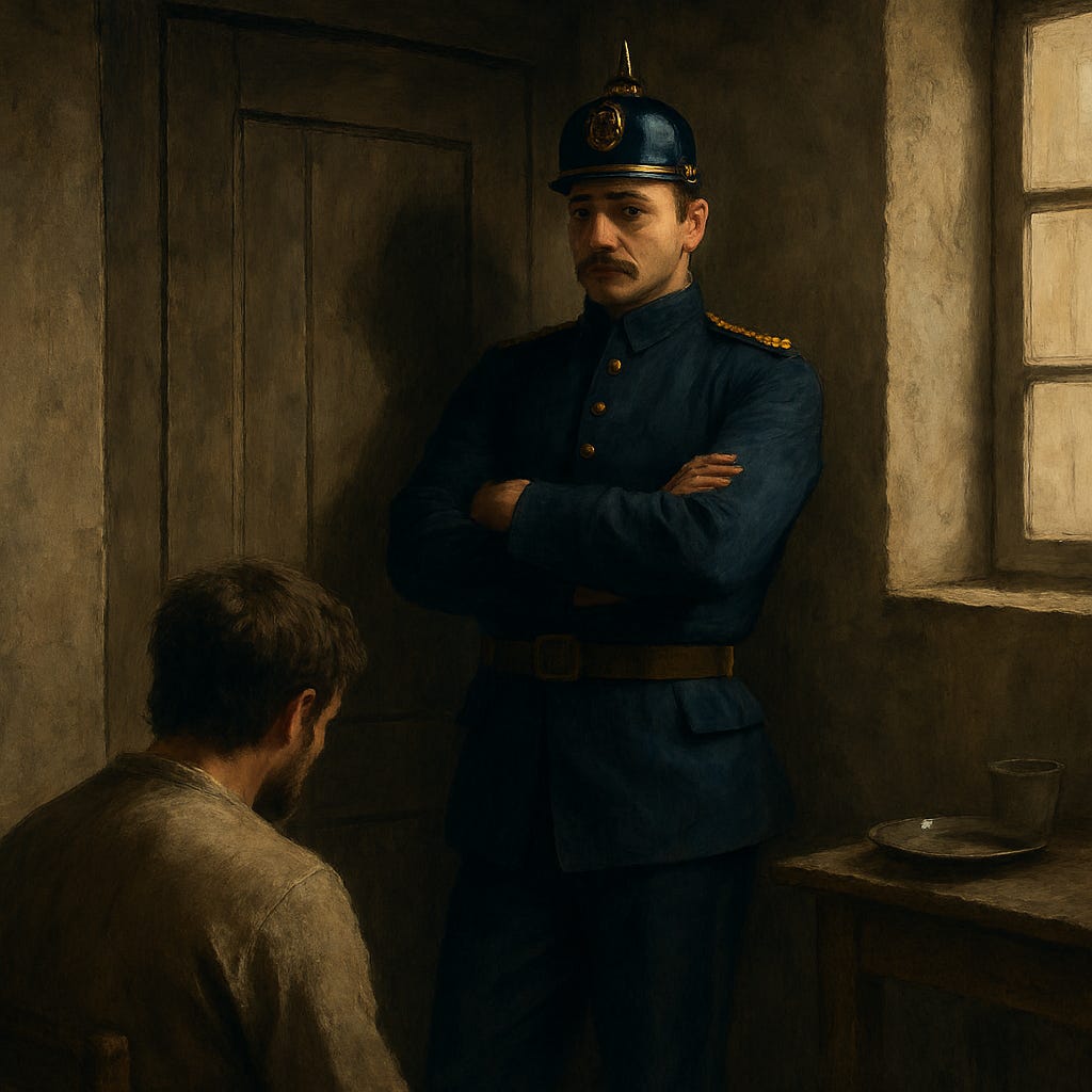 Late Tuesday afternoon, Johann stiffened at the sound of hurried boots echoing down the hall, voices urgent but indistinct. The door rattled slightly with each step. A heavy rap struck the wood, followed by the creak of the hinges, announcing the guard’s arrival. He held the door ajar as Leutnant Krüger stepped through, eyes darting briefly to Johann.
