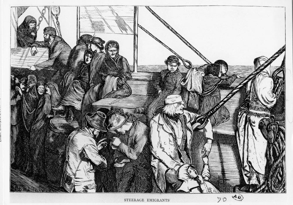 After his damaged papers passed a second inspection, Johann followed the others up the gangway and boarded the Union. He was directed into steerage, where bunks filled quickly and the air grew close. As the ship put out to sea the next morning, Johann lay awake listening to the rush of water against the hull. The young man in the bunk nearby picked up their conversation.